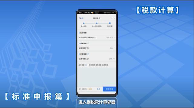 7、隨后,進(jìn)入到稅款計(jì)算界面,系統(tǒng)會(huì)根據(jù)收入及減除數(shù)據(jù),顯示應(yīng)納稅額、減免稅額和已繳納稅額,通過(guò)計(jì)算結(jié)果,右下方會(huì)顯示【應(yīng)補(bǔ)稅額】或【應(yīng)退稅額】,確定無(wú)誤后便可點(diǎn)擊【提交申報(bào)】。