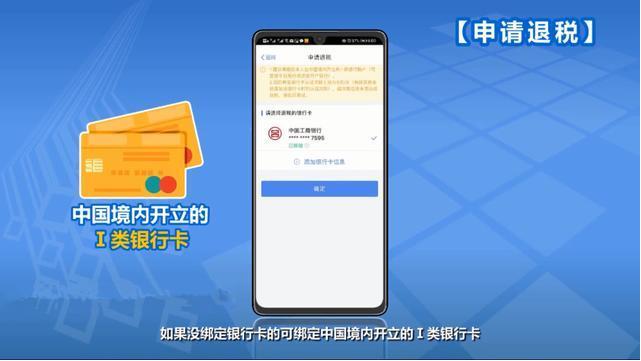 10、如果您需要辦理退稅,可點(diǎn)擊【申請(qǐng)退稅】。進(jìn)入退稅申請(qǐng)界面,選擇在中國(guó)境內(nèi)開(kāi)立的I類銀行卡進(jìn)行綁定,即可完成退稅申請(qǐng)。